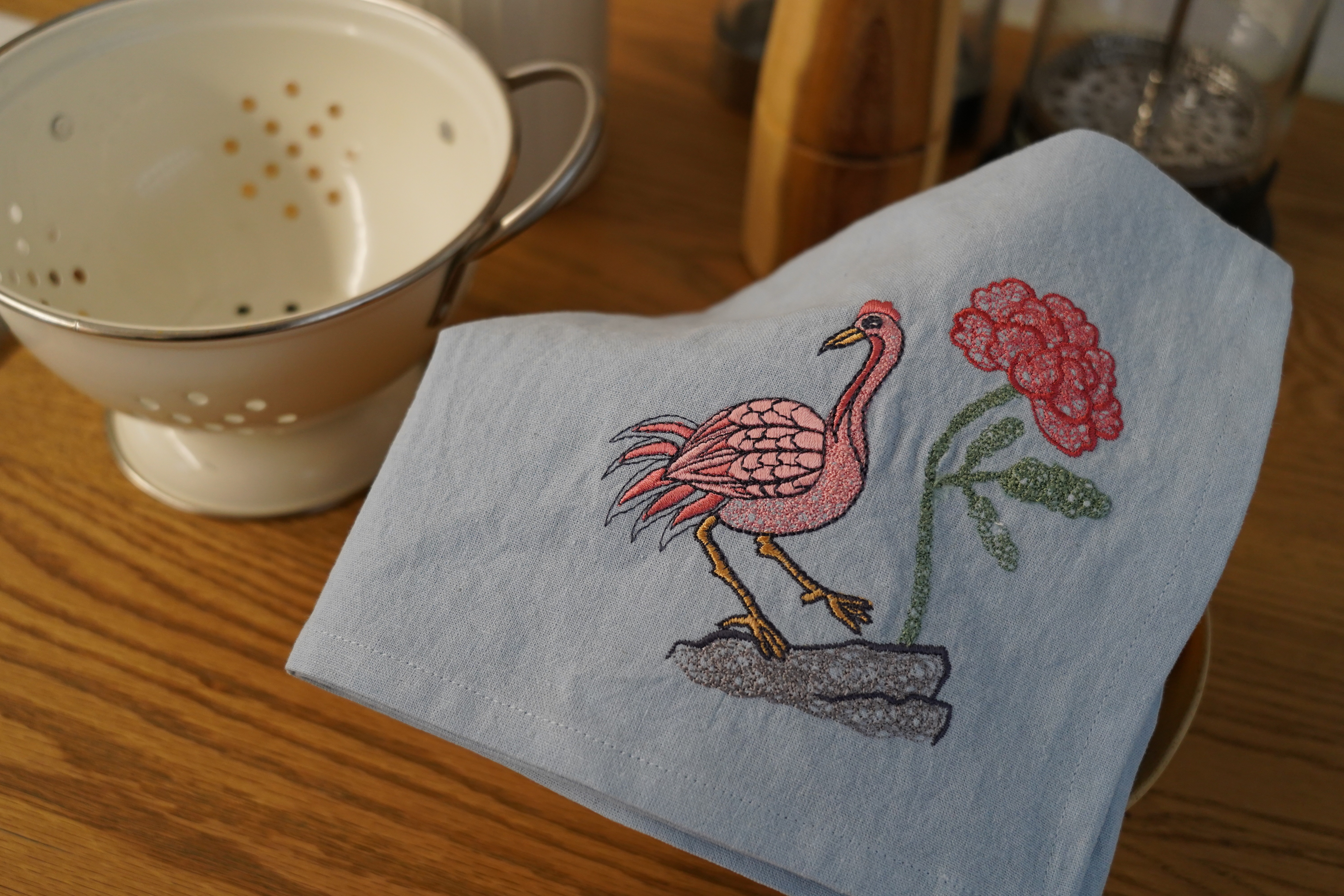 A crane signifies longevity and a peony symbolizes wealth and prosperity.